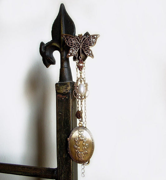 Brass Locket Necklace with Butterfly and Pearls