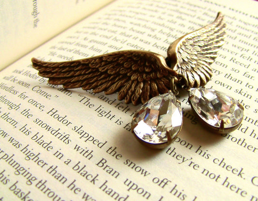 Brass Wings Earrings with Swarovski Crystal Drops