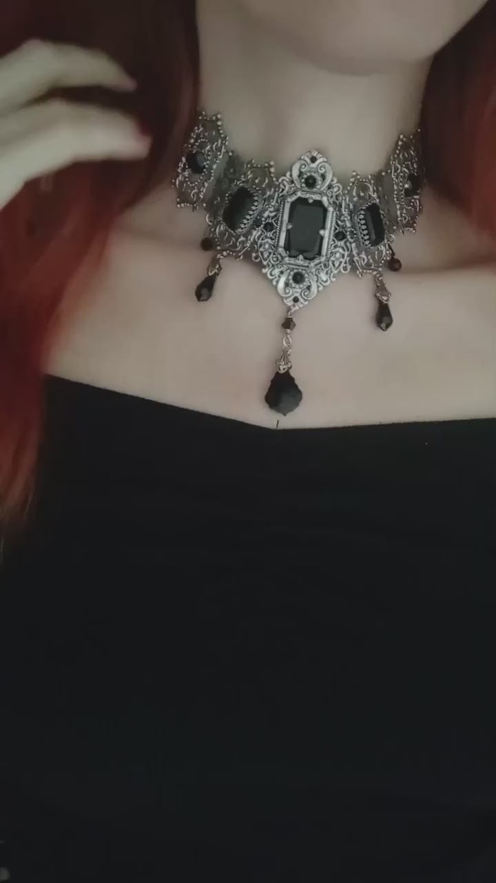 I have placed a large black octagon crystal in the center of the choker, with small round black crystals creating a cross shape around it.