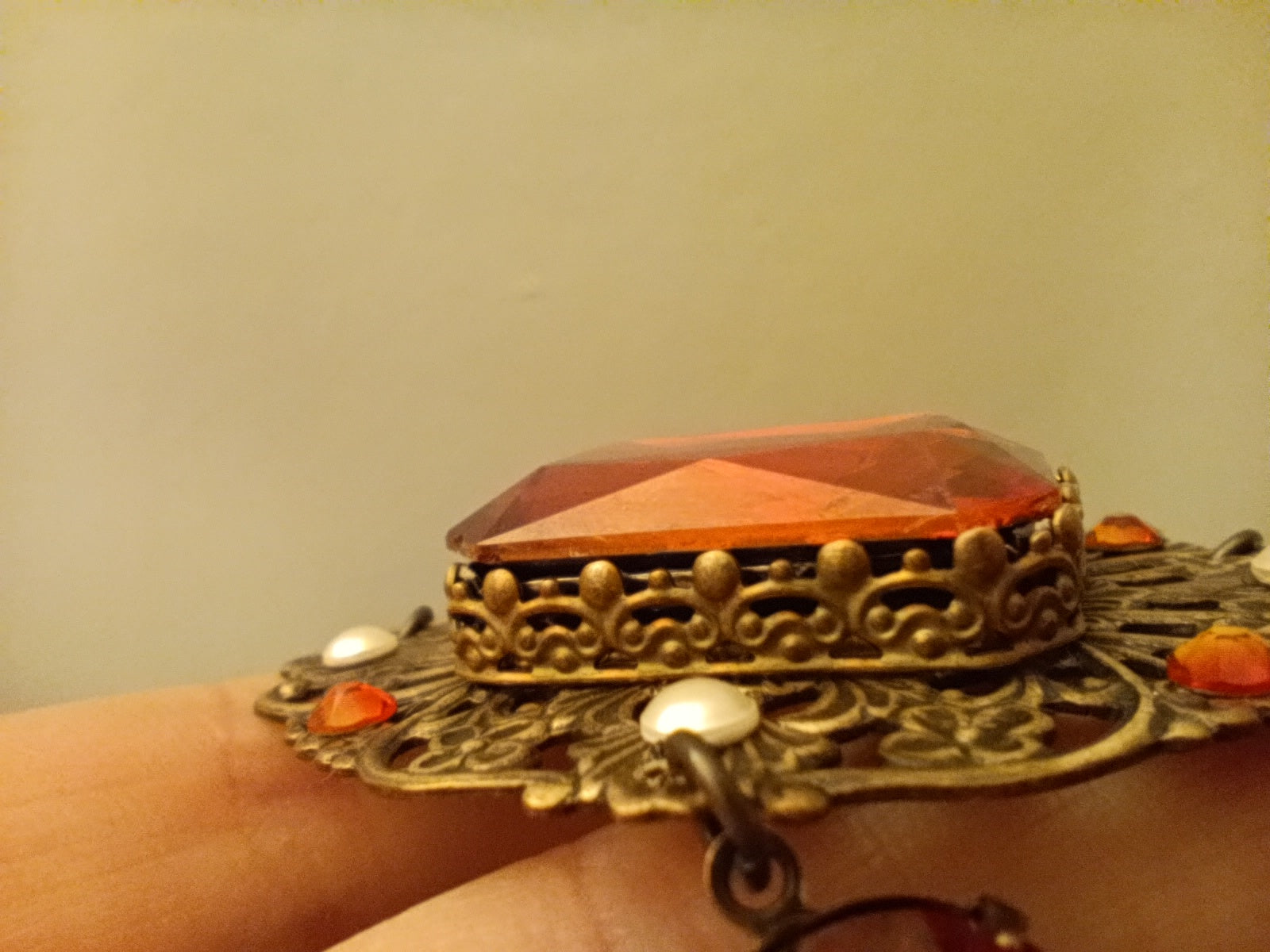 The centerpiece features a brass medallion that hosts a large rectangle magma red crystal encased in hand set ornate gallery wire with smaller rhinestones and pearls around it.