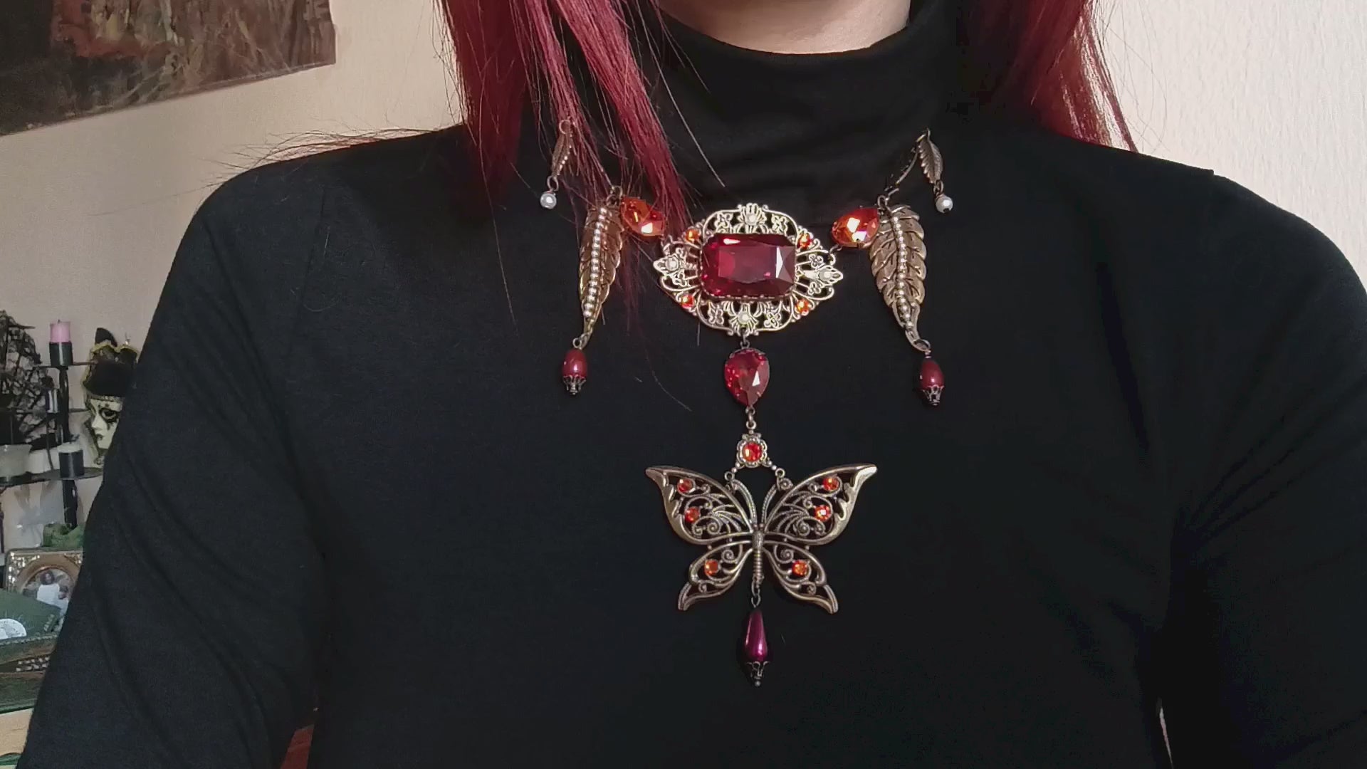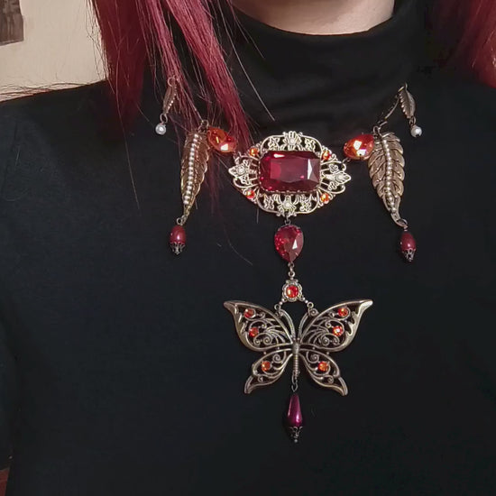 Brass filigree butterfly and red crystals necklace