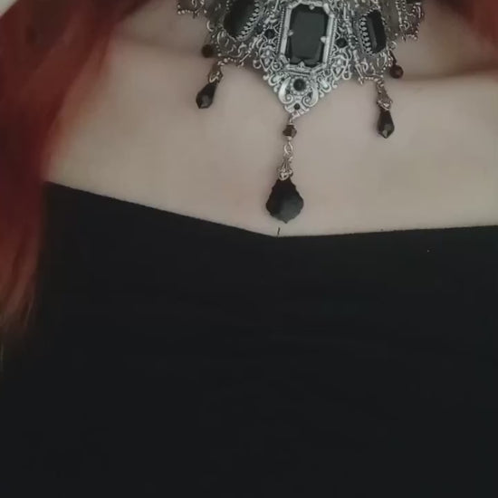 I have placed a large black octagon crystal in the center of the choker, with small round black crystals creating a cross shape around it.