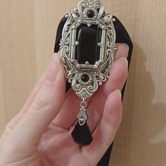 A gorgeous large octagon Swarovski jewel is set in intricate Gothic style frames accented by smaller Swarovski rhinestones. A baroque shaped Swarovski jewel is suspended from a filigree component below.