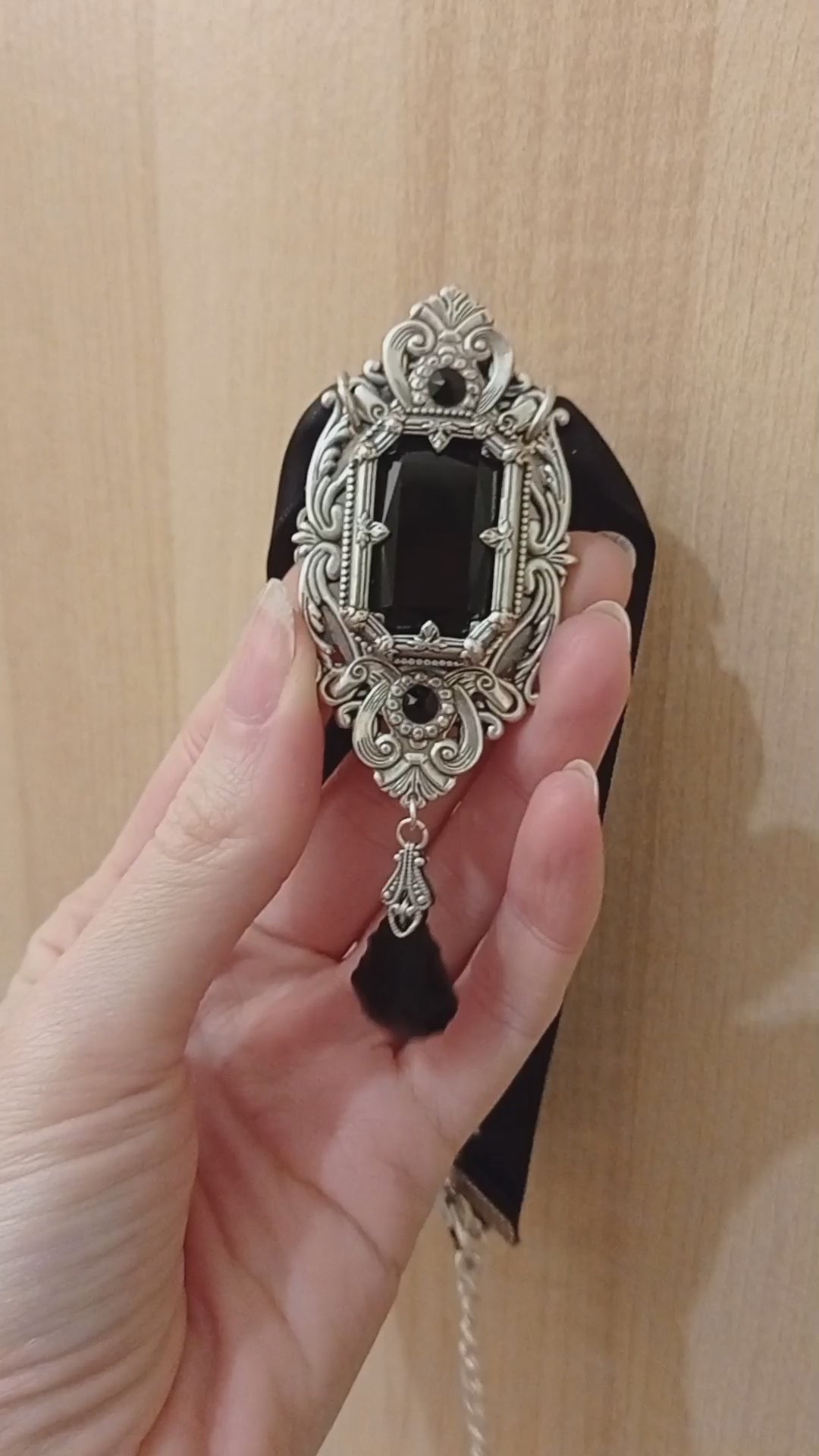 A black satin ribbon holds the pendant and hooks around the back with a lobster clasp and an extension chain, so you don't have to tie the ribbon each time and eventually wear it out.