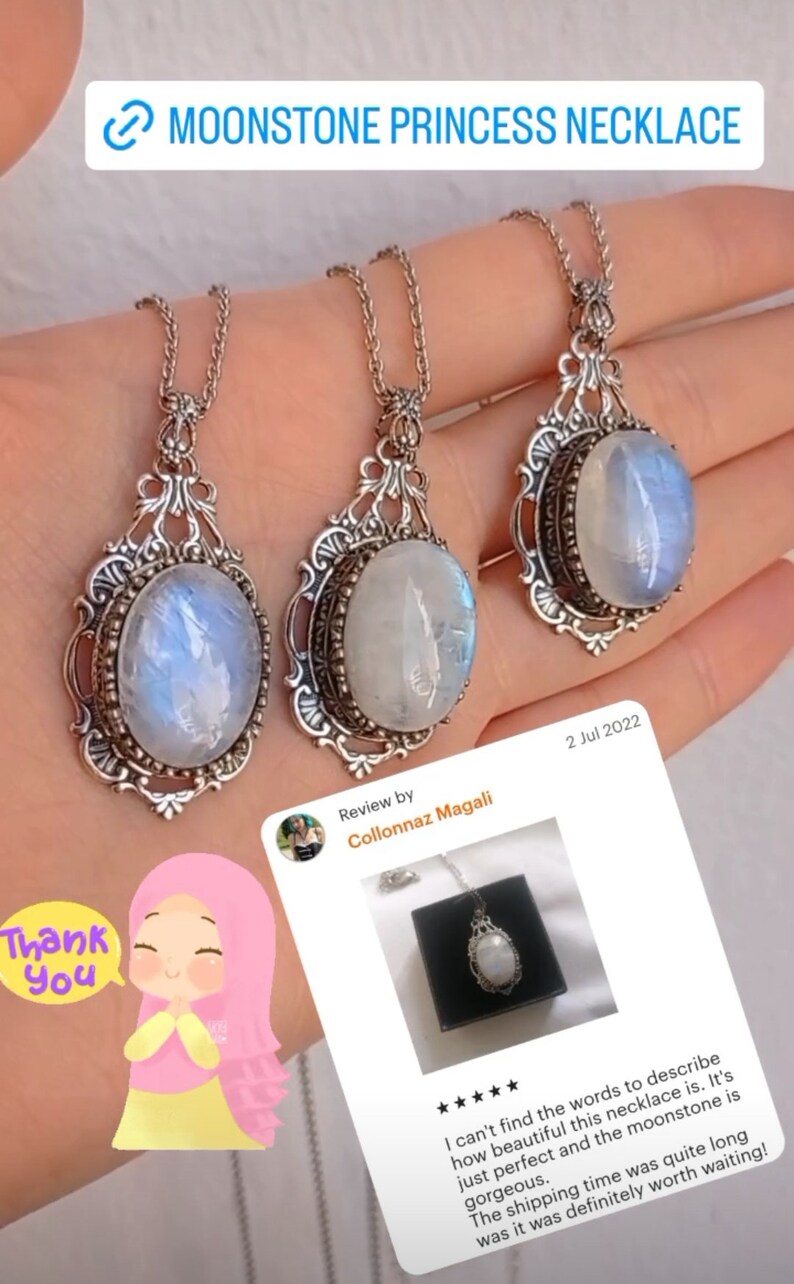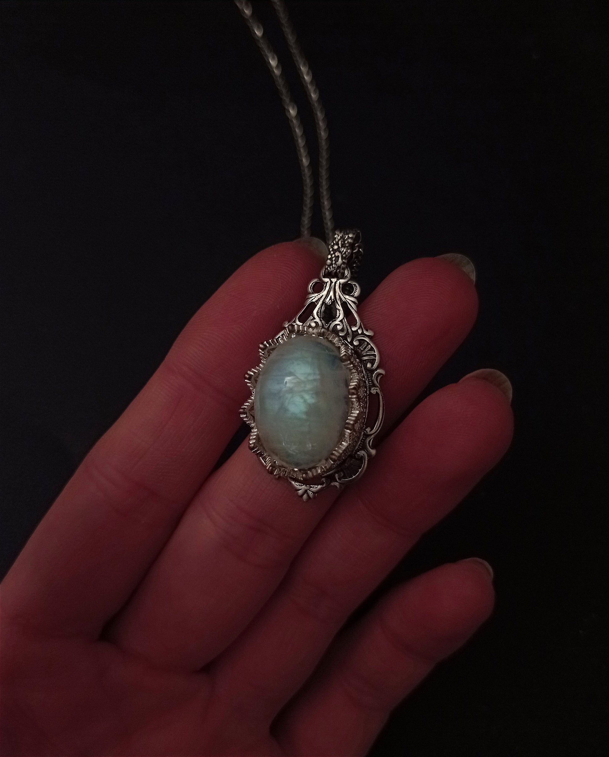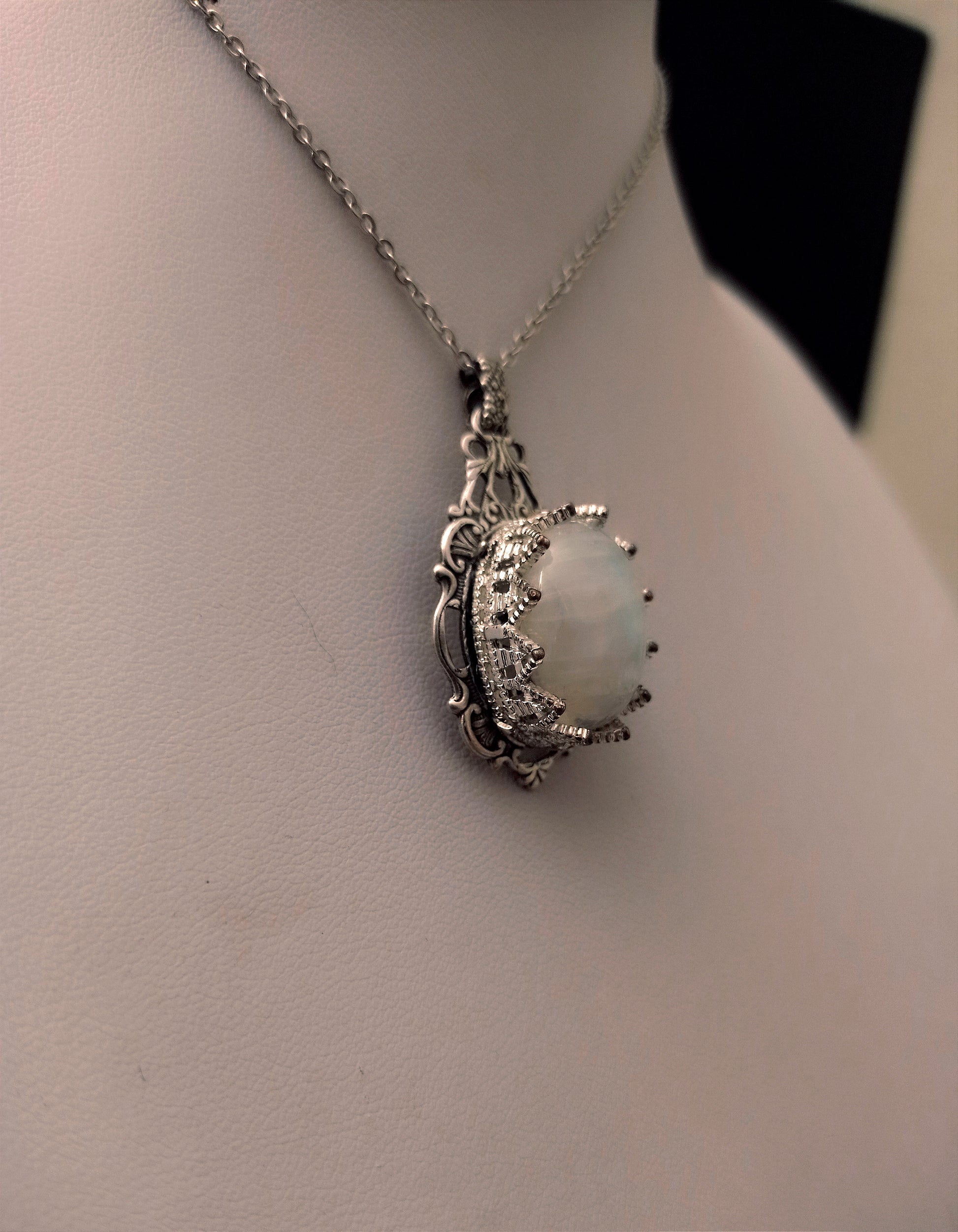 This beautiful necklace is inspired by Medieval Gothic themes, a delicate and feminine piece that will make an impression. The rainbow moonstone cabochon is set in a "crown-shaped" setting that is elevated so the light passes through the intricate Fleur-De-Lys' for a lace-like effect. The stone has natural bright blue flashes that change with every movement.
