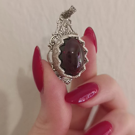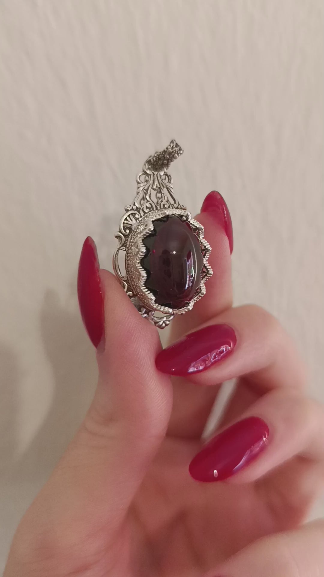 This beautiful necklace is inspired by Medieval Gothic themes, a delicate and feminine piece that will make an impression. The Garnet cabochon is set in a "crown-shaped" setting that is elevated so the light passes through the intricate walls for a lace-like effect. The gemstone itself is a very dark brownish red that appears almost black and only shows its colour against light.