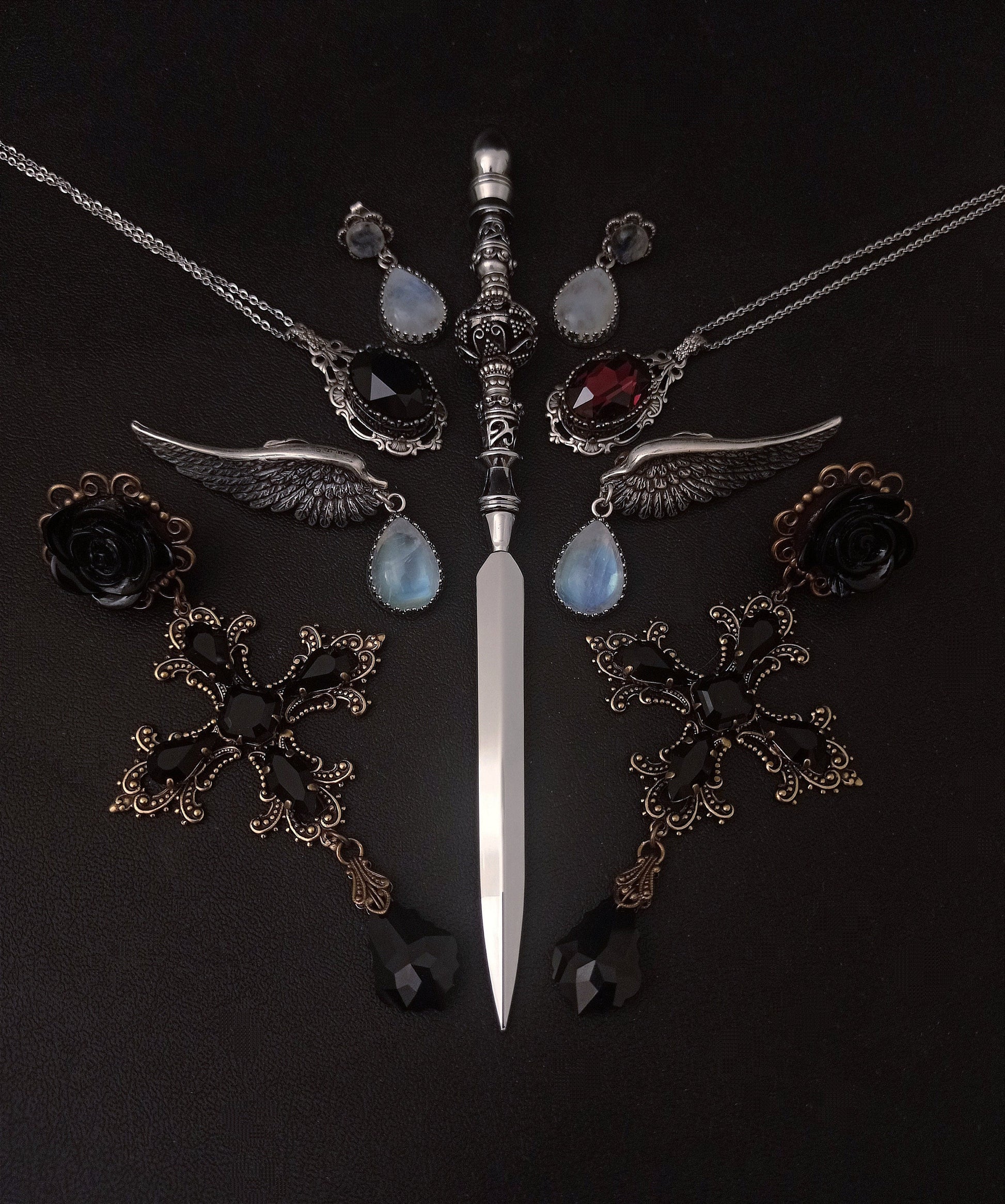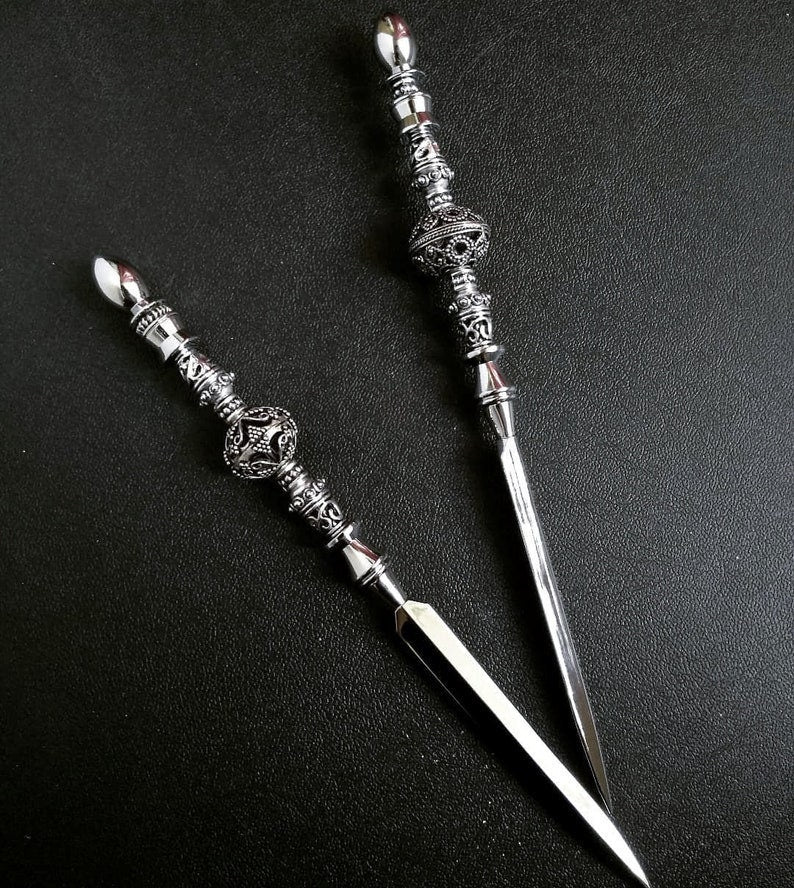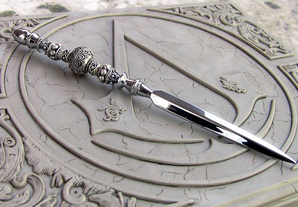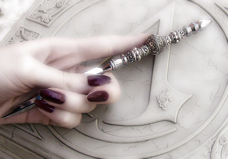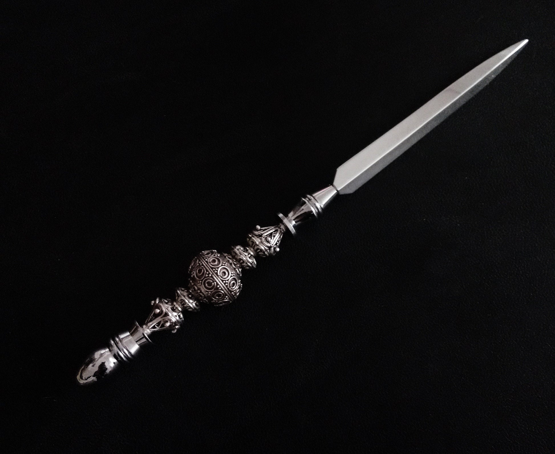 This Gothic letter opener, is adorned with sterling silver plated beads with elaborate designs, giving it a very special and antique dark academia look.