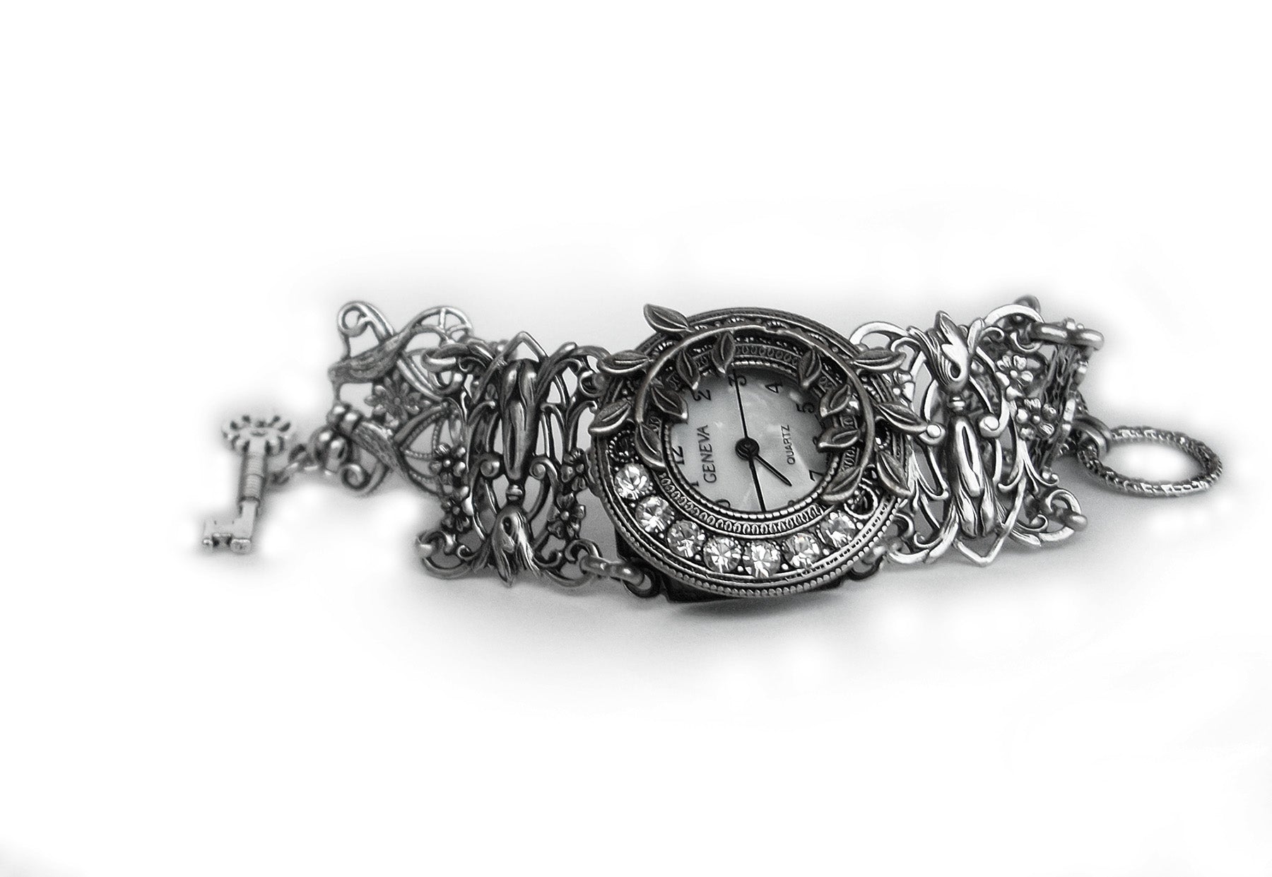 It has several detailed filigree components on the sides, and I have altered the watch face by adding several settings, Swarovski crystal rhinestones and some silver leaves.For the back, I have wire wrapped a small key and in combination with a circle full of tiny hearts, I have created a toggle clasp.