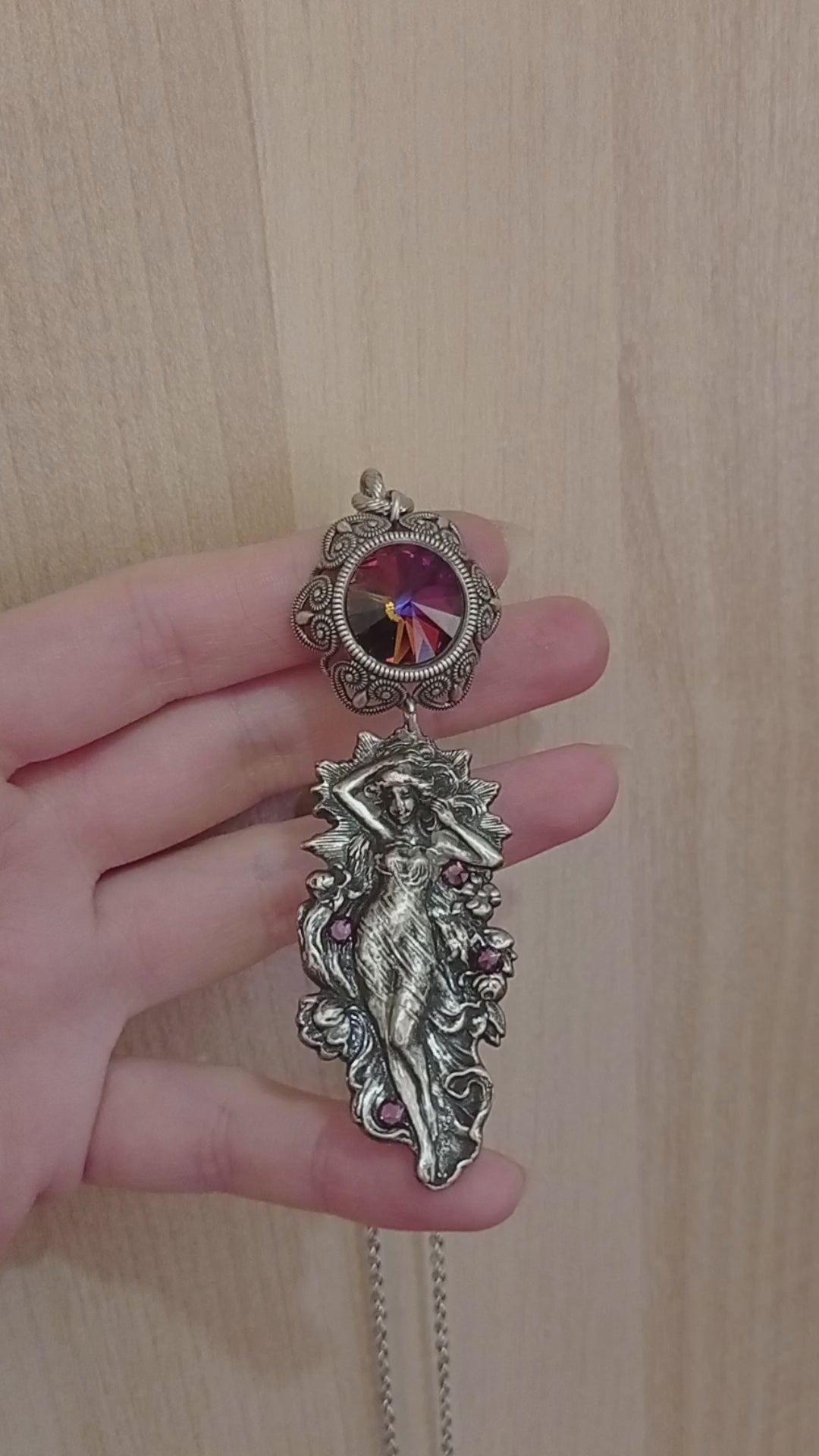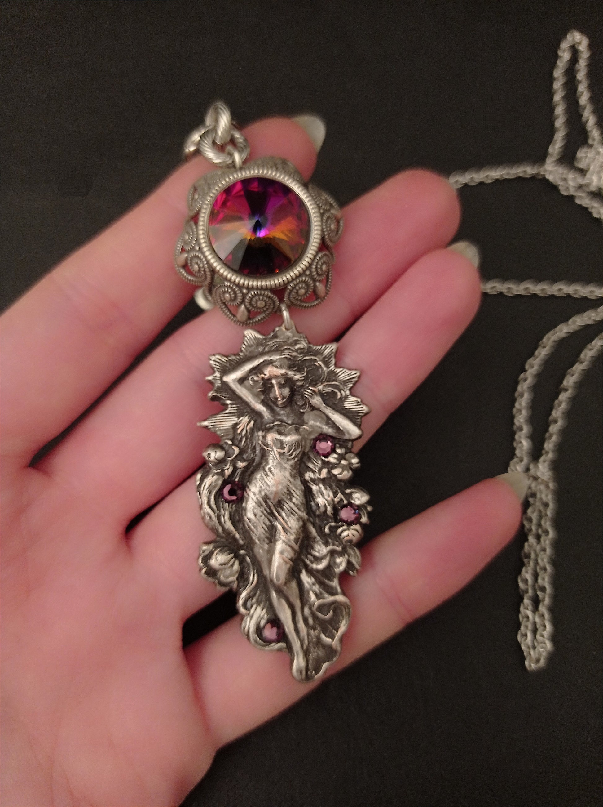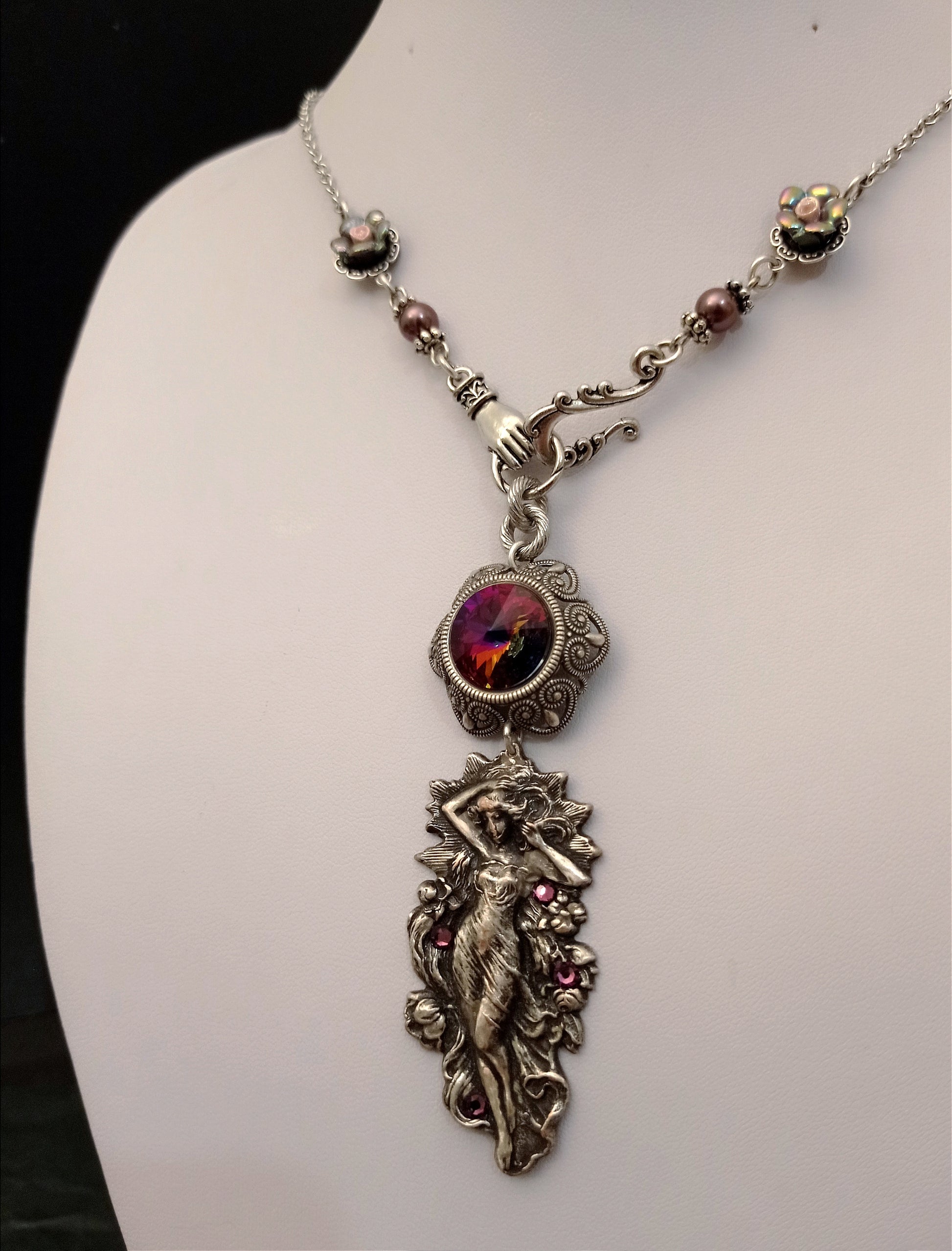 I thought of feminine yet powerful elements for this necklace. Soft lilac pearls and roses, and a fiery purple/orange core. A female figure walks amongst flowers and more purple splashes.